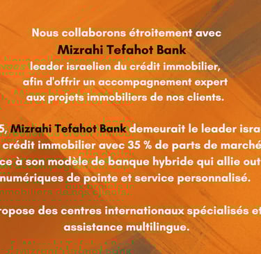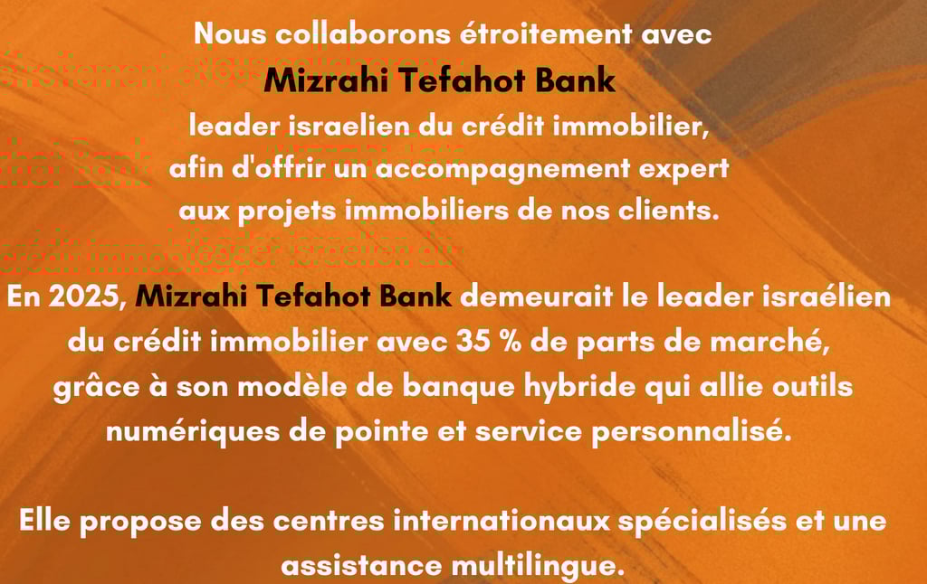 Nous sommes ravis de collaborer avec Mizrahi Tefahot, leader incontesté du secteur hypothécaire israélien, qui détient actuellement près de 40 % du marché tout en conservant sa réputation d'institution financière la plus stable et la plus prudente du pays.
